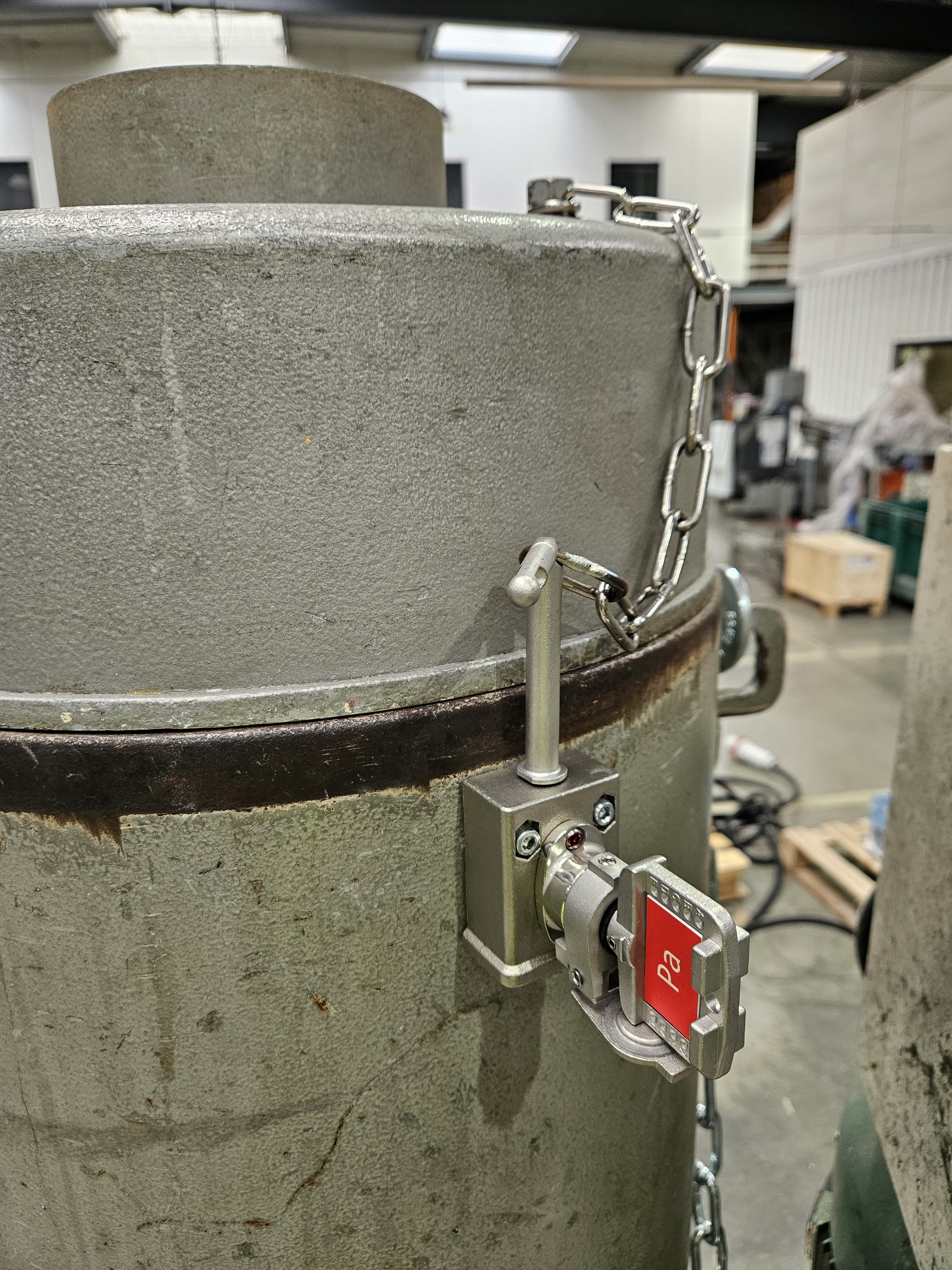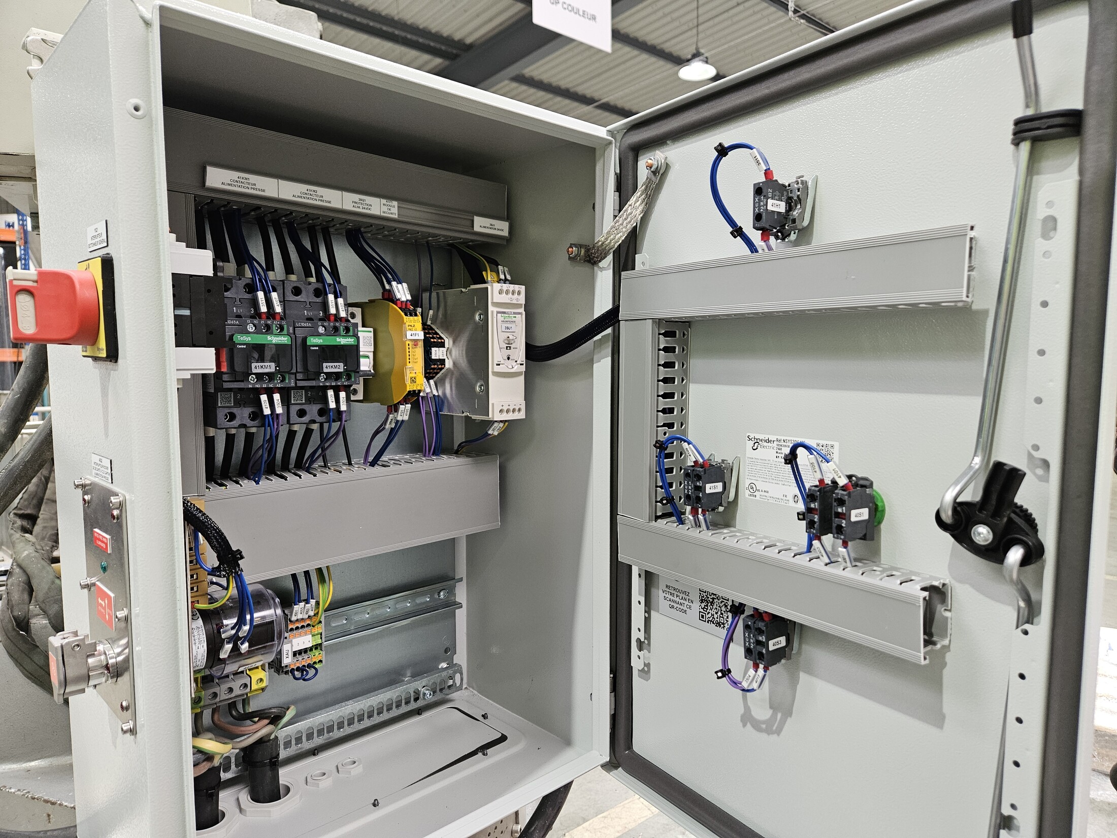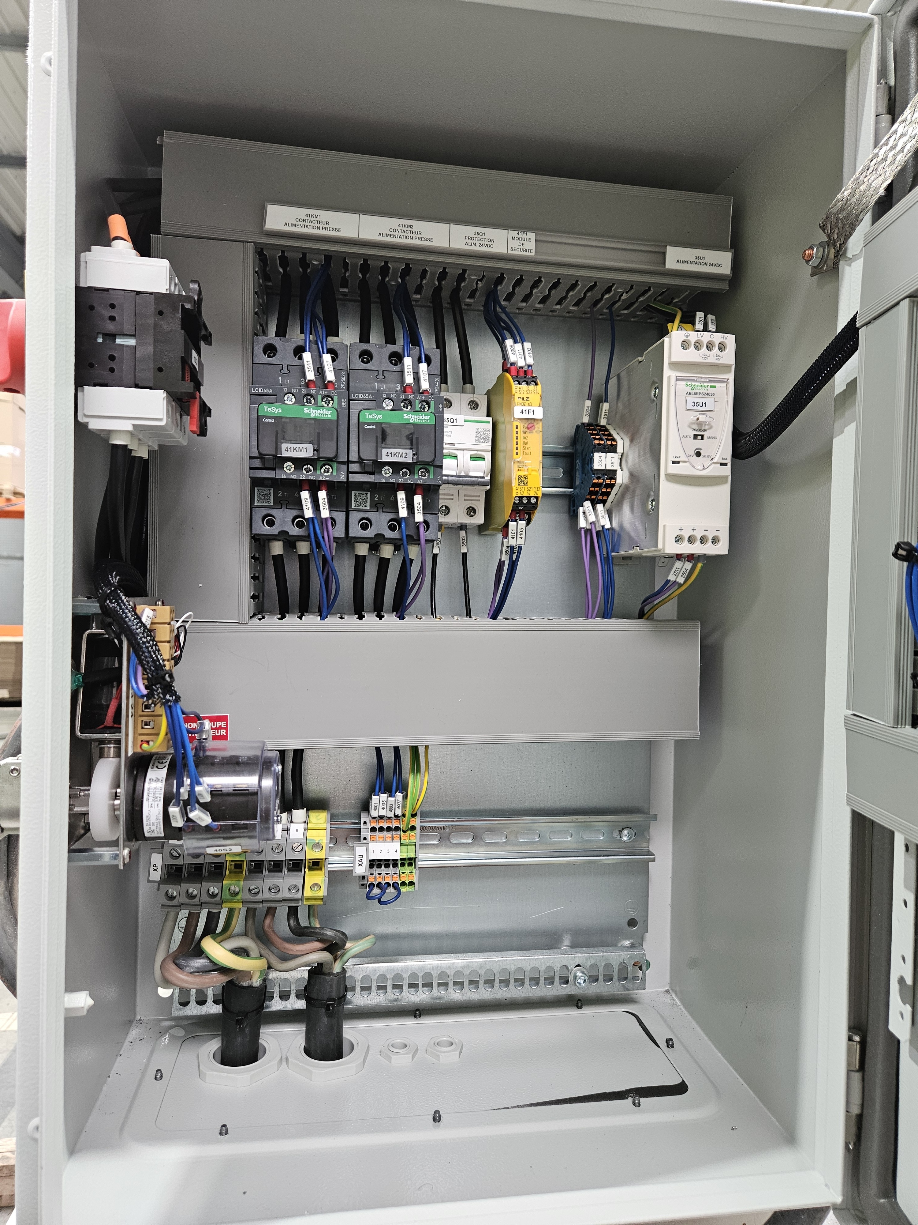 Coffret électrique conçu et câblé pour sécuriser l’accès et le fonctionnement d’une presse à granuler.